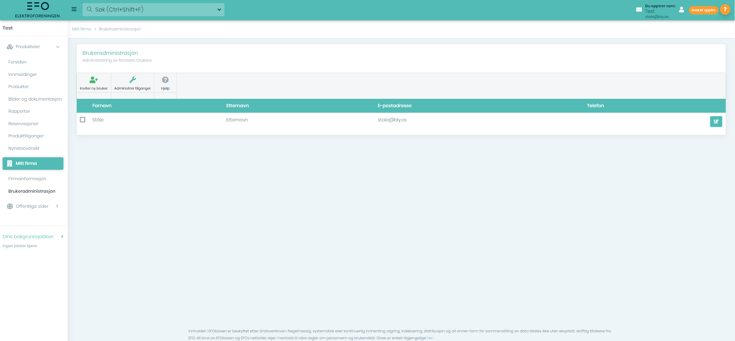 I dette skjermbildet har en en full oversikt og kan administrere firmaets brukere i EFO-basen.
