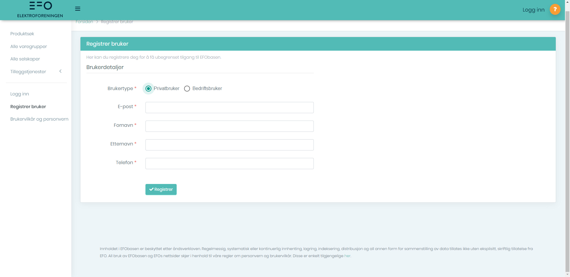 For å få maksimal nytte og ubegrenset tilgang til EFO-basen må du registrere deg som bruker. Du kan registrere deg som privatperson eller som bedriftsbruker.