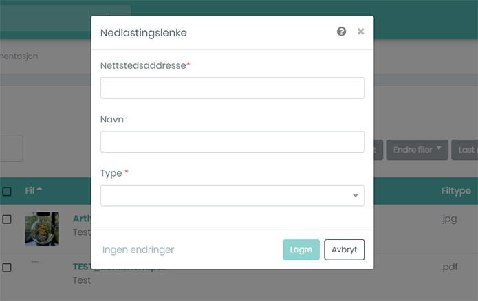 I dette dialogbildet legger du inn nedlastingslenker for bilder og dokumentasjon.