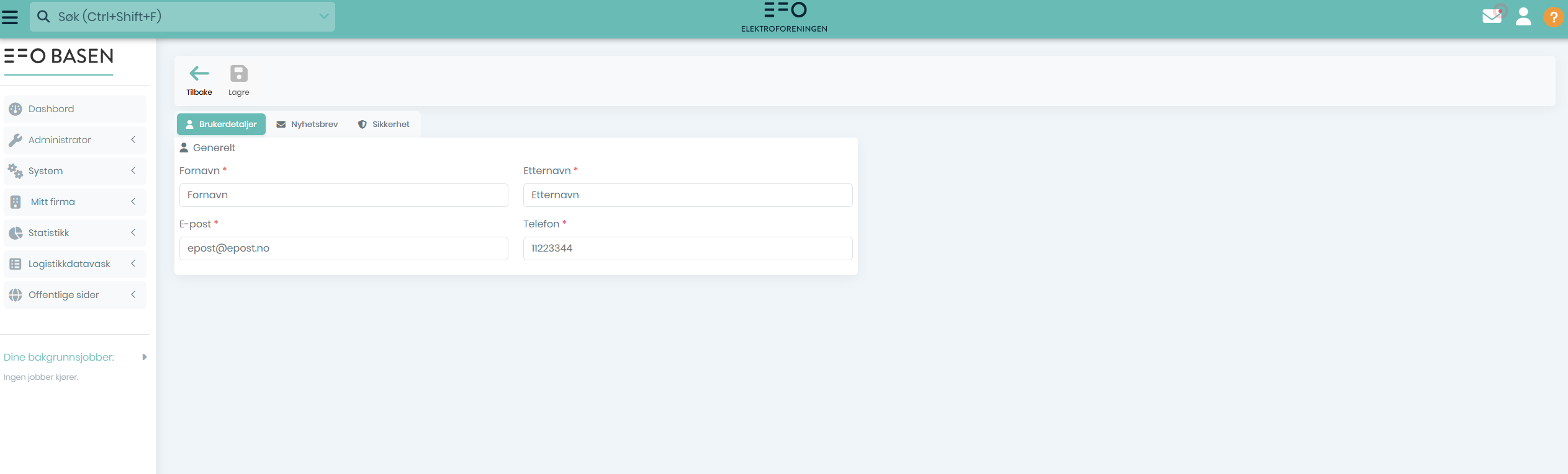 Grunnleggende informasjon om brukeren. Fyll inn alle obligatoriske felter og lagre endringene.