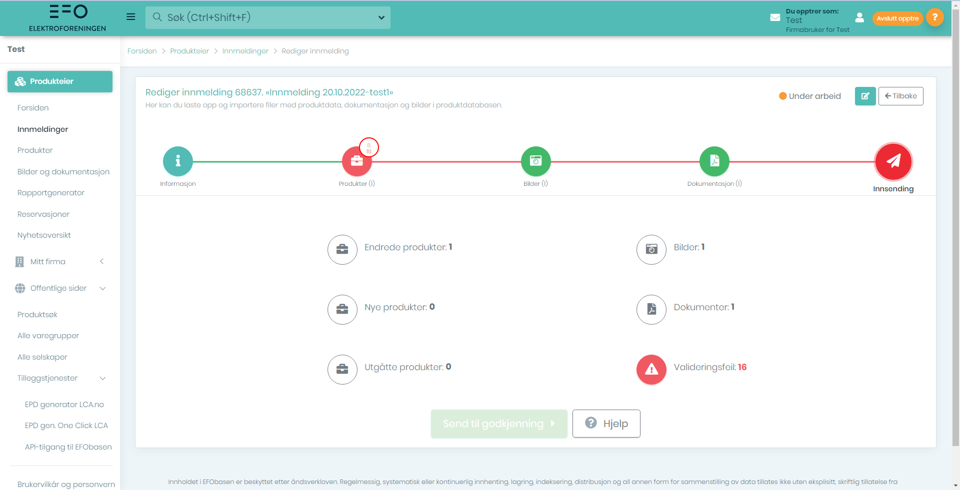 | Endrede produkter | Viser hvor mange produkter som blir endret som følge av innmeldingen. (Tallet forutsetter at alle produkter blir godkjent.) |