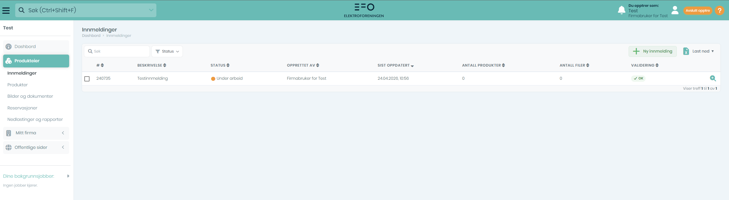 | Tabellvisning alle innmeldinger | Tabell med en rad pr. innmelding. Kolonnene kan sorteres ved å klikke på kolonneoverskriften: #, Beskrivelse, Status, Opprettet av, Sist oppdatert, Antall produkter, Antall filer og Validering. Nederst i tabellen finner du paginering med mulighet for å bla mellom sider og velge antall rader pr. side. |