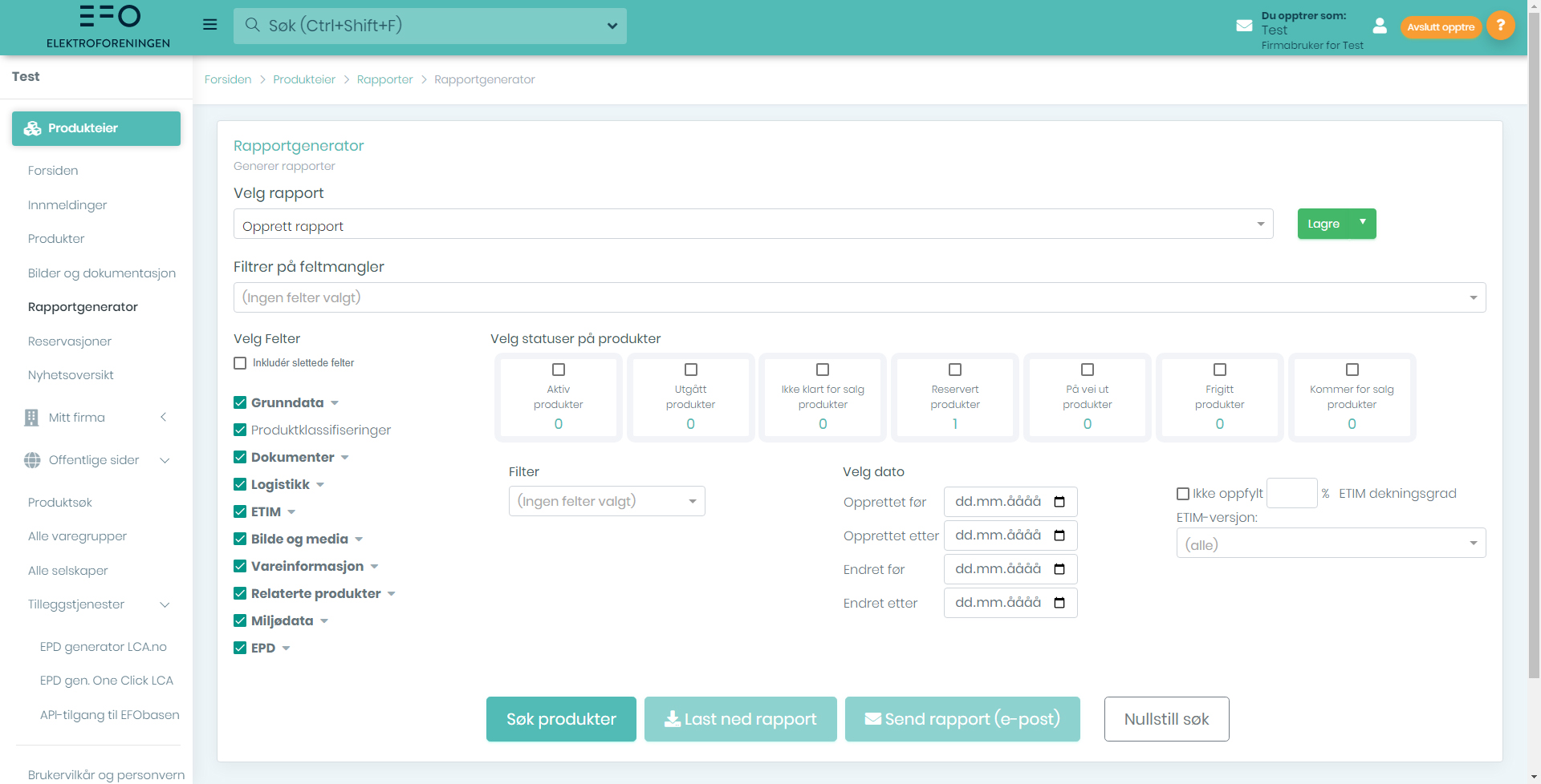 | Filtrer på feltmangler | Her kan du velge hvilke felter som skal sjekkes om mangler verdier på produktene |
